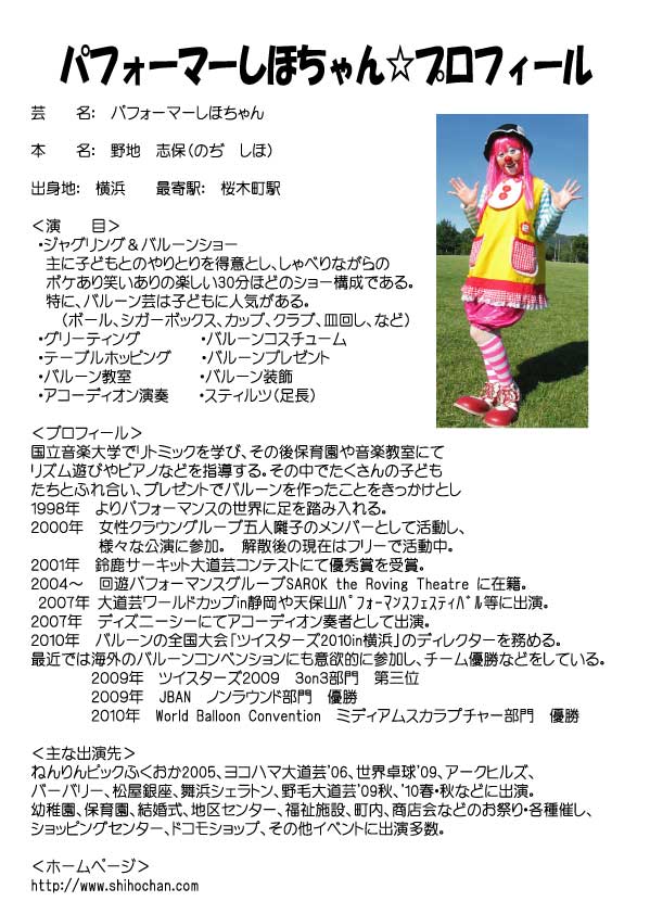 「しほちゃんってどんな人なの?」と思ってるアナタにこっそり教えちゃいます! ![]() しほちゃんはバルーンが大好き。 細長いバルーンで動物を作ったり、何本も使ってコスチュームやドレスまで作ってしまいます! なかでもしほちゃんは面白いバルーンが大好きで、バルーンを使って遊ぶのが得意です。 クラウンのしほちゃんもナチュラルフェイスのしほちゃんもどっちもお喋りです。 ショーでは子どもたちとコミュニケーションをとったり、ゲームをしたり、ピアニカだって弾いちゃいます♪ 楽しい時間になること間違いなし。 それがパフォーマーしほちゃんです! ※プロフィールの詳細が必要な方はこちらをクリックしてください。 |